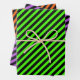 A set of striped wrapping paper in trick or treat Halloween colours; slime green,pumpkin orange,poison purple.