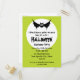 Green Halloween costume party invitation with a big white moon and a black bat at the top. All text are templates to make it easy to add your own details.