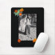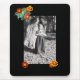 The design on this mousepad is a photo of a girl dressed in a Halloween costume as a witch standing by a tree with leaves on the ground. The photo is framed by a black background. At the top left corner, there is a cutout photo of a cluster of marigolds. Three marigold photo cutouts are across the bottom of the photo. The photo can be personalised with your own photo. If you need help with customising, please contact me.