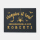 Classic and elegant Halloween doormat for fall with dark, spooky grey faux burlap background - "creepin' it real" text in butternut orange with bats, a spider, and your family name