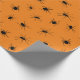 Creepy Halloween wrapping paper printed with lots of creepy crawly spiders. Black spider pattern on orange background. Spooky Halloween gift wrap.