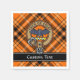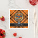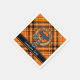 Halloween crest badge with flying bat surrounded by a strap and buckle over tartan background. Custom text.