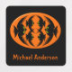 This awesome sheet of clothing labels features an orange oval with six crows in it. Each crow has yellow eyes with black pupils and outstretched wings. The crows are flying towards each other forming an oval shape. The background is black. There is custom text so you can include the name of your child.