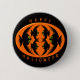 This spooky Halloween button features an orange oval with six crows in it. Each crow has yellow eyes with black pupils and outstretched wings. The crows are flying towards each other forming an oval shape. The background is black and around the outside of the oval, in creepy orange text, it says "Happy Halloween".