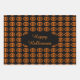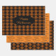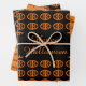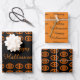 This awesome gift wrap set features an orange oval with six crows in it. Each crow has yellow eyes with black pupils and outstretched wings. The crows are flying towards each other forming an oval shape. The background is black and there is custom text so you can include a message of your choice.