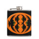 This awesome flask features an orange oval with six crows in it. Each crow has yellow eyes with black pupils and outstretched wings. The crows are flying towards each other forming an oval shape. The background is black.