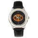 This awesome watch features an orange oval with six crows in it. Each crow has yellow eyes with black pupils and outstretched wings. The crows are flying towards each other forming an oval shape. The background is black.