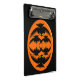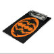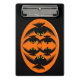 This awesome mini clipboard features an orange oval with six crows in it. Each crow has yellow eyes with black pupils and outstretched wings. The crows are flying towards each other forming an oval shape. The background is black.