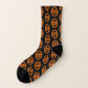 This awesome pair of patterned socks features an orange oval with six crows in it. Each crow has yellow eyes with black pupils and outstretched wings. The crows are flying towards each other forming an oval shape. The background is black.