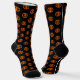 This awesome pair of patterned crew socks features an orange oval with six crows in it. Each crow has yellow eyes with black pupils and outstretched wings. The crows are flying towards each other forming an oval shape. The background is black.