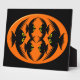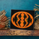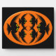 This awesome plaque features an orange oval with six crows in it. Each crow has yellow eyes with black pupils and outstretched wings. The crows are flying towards each other forming an oval shape. The background is black.