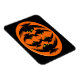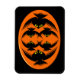 This awesome magnet features an orange oval with six crows in it. Each crow has yellow eyes with black pupils and outstretched wings. The crows are flying towards each other forming an oval shape. The background is black.