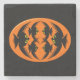 This awesome Stone Coaster features an orange oval with six crows in it. Each crow has yellow eyes with black pupils and outstretched wings. The crows are flying towards each other forming an oval shape. The background is black.