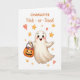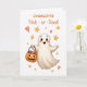 A cheerful little ghost floats happily with a pumpkin pail full of candy, surrounded by twinkling stars and playful hearts. This Halloween design is extra special with the option to add a personalised name on the front, making it a thoughtful choice for a daughter, niece, granddaughter, or any special girl you want to surprise. Inside, the sweet message brings smiles and giggles, celebrating the fun of the season with warmth and charm. A delightful keepsake for Halloween that feels both festive and personal.