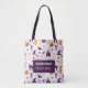 Customise this cute trick or treat Halloween tote bag with your child’s name. Illustration is fun Halloween scary, ghostly collage. Accenting purple and yellow colours make this cute bag pop! Great bag that can be used for many Halloweens to come! Other tote bag sizes, colours, and styles are available