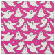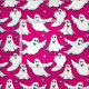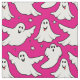 Adorable fabric printed with cute cartoon ghosts, on a pink background. The sweet little happy ghosts are laughing and smiling.