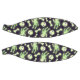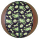 Drawings of a cute spooky skeleton, bones, and skulls that look like greenish glow in the dark colour on a dark purple black background and purple space stars in their eyes. They are arranged in a non-directional all-over halloween pattern. Please note this print does not actually glow in the dark, it's just artwork that I made to resemble glow in the dark.