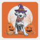 Cute Dalmatian in a purple witch's hat with spooky jack-o-lanterns for Halloween.