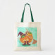 A small bag with the illustration of an adorable puppy hiding behind two pumpkins . We can also see the black and purple shoes and hat of a witch . All these on a green background . Make a cute bag for trick-or-treating . © ArianeC Illustrations