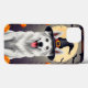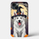 Cheerful white dog wearing a black witch's hat with a yellow buckle. The background includes a large full moon, casting a gentle light, and is surrounded by spooky elements like flying bats. At the bottom, there are vibrant orange pumpkins with carved faces, adding to the Halloween theme. The overall atmosphere is playful and festive, celebrating the Halloween spirit with the dog as the central figure.