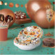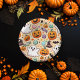 Halloween ghosts, jack-o-lanterns, witches hats and candy on an orange background.