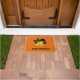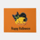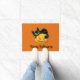 Door mat shown with a orange background and a Halloween pumpkin and black cat print.