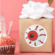 An eyeball sticker for Halloween, red veins and iris looking to the right.