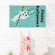 This cloth event or holiday decoration banner is a blue green colour covered in little black stars with a white fancy ghost wearing a blue top hat with gold ribbon holding a black cane topped with a golden skull. Customise the Happy Halloween text with the template.