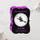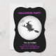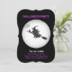 Beautiful Halloween flying witch and black cat Party Invitation. Black cat pattern on ultraviolet background on the back side. All texts and numbers are ready to be personalised.