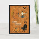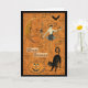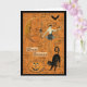 Halloween card with scary moon, bat, costumed woman, pumpkin, and black cat and old text in background