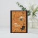 Halloween card with scary moon, bat, costumed woman, pumpkin, and black cat and old text in background