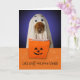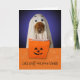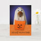 Funny and cute Halloween card features a golden retriever breed dog wearing a sheet ghost costume holding an orange jack o lantern treat bag.