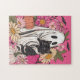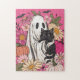 This cute halloween puzzle features a charming ghost cuddling a wide-eyed black cat, surrounded by whimsical fall florals, pumpkins, and fluttering bats — all set against a bold pink background. This cute and quirky design blends spooky season vibes with cottagecore charm and girly flair, perfect for anyone who loves Halloween with a side of flowers and fun.