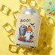This fun can cooler has a cute ghost wearing an orange knit hat. He's standing next to a headstone that says RIP, and a jack o'lantern. Bats are flying among the stars. He's also carrying an orange drink with a bat on it. Background is a pale orange and white polka dot pattern. It says BOO! at the top These coolers are perfect for your Halloween get togethers!