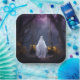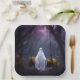 White ghost sitting on a forest swing in dark woods for Halloween party