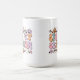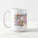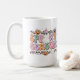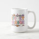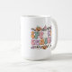 Cute, fun, colourful, feminine retro style Halloween Ghosts Spooky Season mug with ghosts wearing sunglasses and witch hats, pumpkins, flowers, and skulls, and text of melon, lavender, pink, and teal that reads Spooky Season!