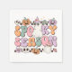 Cute, fun, colourful, feminine retro style Halloween Ghosts Spooky Season paper napkins with ghosts wearing sunglasses and witch hats, pumpkins, flowers, and skulls, and text of melon, lavender, pink, and teal that reads Spooky Season!