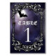 Here's a spooky theme design with a black bat flying against a full moon on a dark grey cloudy night. At the top of the design is an ornate iron rod with a brown recluse spider and a white spider web. Another spider is hanging from the web. If you're having a Gothic or Halloween themed wedding or event, this is an excellent table card for your party.