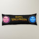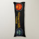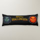 The striking long body cushion features the enigmatic green moon face and the intense fiery orange face flank a bold vintage style Halloween greeting set against a deep, sleek black background this high detail illustration perfectly balances Gothic elegance with seasonal fund whether you're decorating for a solid gathering or simply love dark celestial themed art this soft and supportive pillow is a standout functional art piece