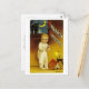 Vintage Halloween greeting card illustration showing a Victorian child frightened by a black cat at the window.