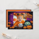 The Halloween greeting card has a fun and spooky design, with a cartoon-style border featuring classic Halloween imagery. The frame surrounding the photo space is adorned with playful yet eerie elements like grinning jack-o'-lanterns, flapping bats, and twisted, bare-branched trees. The colours are vibrant, with oranges, blacks, and purples creating a festive yet mysterious vibe.
