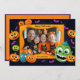 This Halloween greeting card features a central photo space surrounded by a playful and lighthearted Halloween theme. The border around the photo is filled with cartoon-style pumpkins and various funny monsters, each with their own quirky personalities. The pumpkins have wide, goofy grins, and the monsters range from silly ghosts with friendly expressions to cute, colourful creatures with exaggerated features. Purple bats flutter around the edges, adding to the whimsical atmosphere.