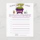 Fun halloween theme baby shower "guess the baby food" game card featuring illustration of a witch's purple cauldron with green fume coming out. The text inside the pot says "a baby is brewing." The texts are editable. Perfect game to play during the shower. It asks guests to try the samples of baby food and guess the flavours.