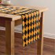 Halloween inspired table runner, featuring a chequered harlequin pattern in orange and black.