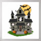 Halloween spooky haunted house complete with ghosts, pumpkins, full moon and scary pumpkins ready for some Halloween trick or treaters.