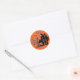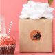 Fun Halloween stickers have an orange swirl background, a haunted house with a black cat looking out the doorway, a ghost in the belfry and another one coming out of the attic. There is a spooky old tree with a lantern hanging from it, gravestones and bats in the sky. Great to use to seal a Halloween card or party invitation, or to give out as party favours.
