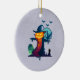 An ornament with a cool halloween illustration. Set on a grey purple background. A large haunted scarecrow, looking evil with a jack-o-lantern pumpkin head, wearing a witches hat. He has a menacing grin wearing tattered robes and is standing in a graveyard with a crow screeching on his arm. Bats flying off in the distance, a full moon in the background and a lone owl with glowing eyes sits on a tombstone.