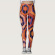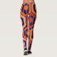 These leggings have a geometric design of hexagons in four shades of orange on a field of black and purple stripes.