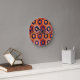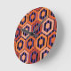 This clock has a geometric design of hexagons in four shades of orange on a field of black and purple stripes.