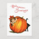 Vintage Halloween illustration of a little girl hiding in the pumpkin from her black cat. Artist: Frances Brundage. Design © HTM Images